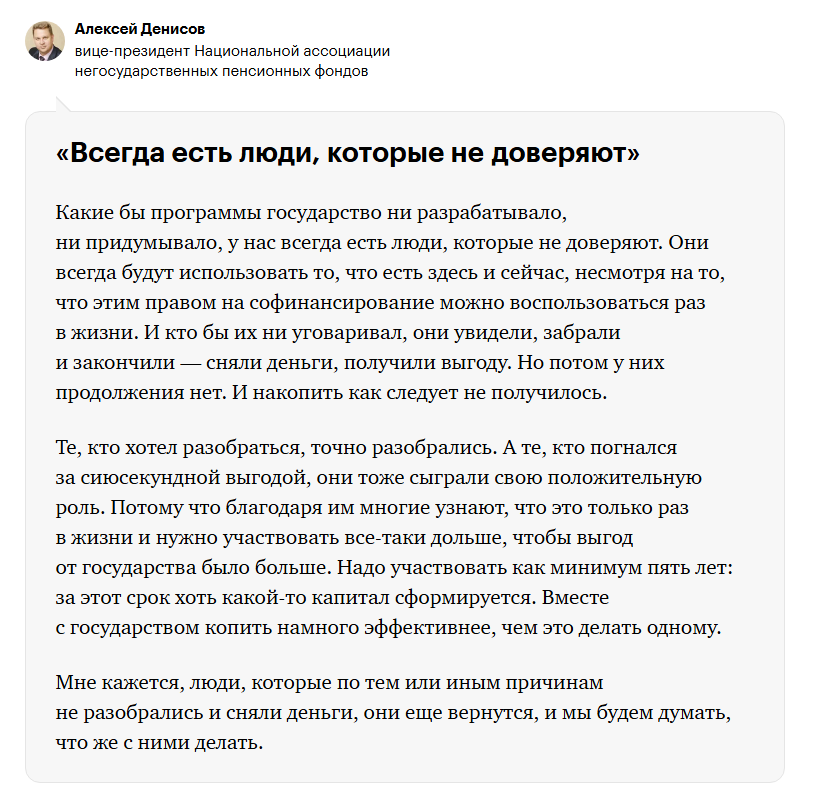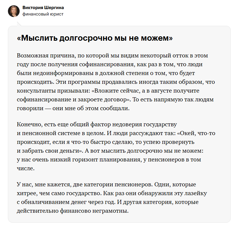 Эксперты, которых опросил Т—Ж, считают, что отток денег со счетов может быть связан отчасти с тем, что при вступлении в программу людям не всегда корректно разъясняли условия участия. А иногда их даже намеренно побуждали использовать ПДС для быстрого заработка. Плюс не все участники верят, что государство будет выполнять взятые на себя обязательства в дальнейшем.