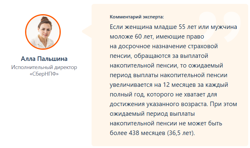 Если у вас есть право на досрочную пенсию, то формула расчёта меняется. Как объяснила «Выберу.ру» исполнительный директор «СберНПФ» Алла Пальшина, в этом случае используется более длительный ожидаемый период выплаты накопительной пенсии.