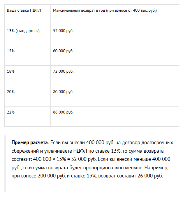 Размер налогового вычета напрямую зависит от ставки НДФЛ, которую вы уплачиваете с ваших доходов. Максимальная сумма, которую можно вернуть, рассчитывается от суммы взносов, но не более установленного лимита. Вычет рассчитывается как процент от внесенной суммы, но не более 400 000 руб. в год. Максимальный возврат налога происходит при внесении именно этой суммы. В таблице ниже показана зависимость максимальной суммы возврата в год при определенной ставке.