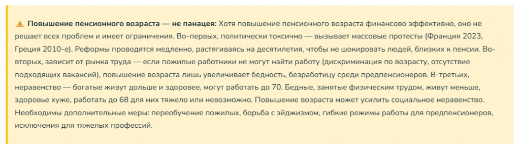 Автоматические стабилизаторы: привязка пенсионного возраста к ожидаемой продолжительности жизни, балансовые механизмы. Это деполитизирует корректировки, делает систему устойчивой.