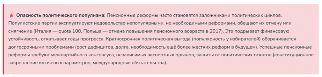 Но есть общие принципы успешных реформ: раннее начало — чем раньше, тем мягче (постепенное растягивание на десятилетия), политический консенсус — межпартийное согласие, участие социальных партнеров (профсоюзы, работодатели), комплексность — затрагивать все элементы системы (возраст, формулы, накопления, гарантии), а не точечные изменения, прозрачность и коммуникация — объяснять населению необходимость, механизмы, защищать уязвимых — минимальные гарантии для бедных, переходные программы для пострадавших от реформ, гибкость — адаптация к меняющимся условиям через автоматические стабилизаторы, периодический пересмотр, доверие — прозрачность управления, защита накоплений от экспроприации, выполнение обещаний.