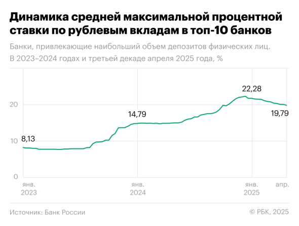 Средняя максимальная ставка по вкладам в десятке крупнейших банков продолжает планомерное снижение. В третьей декаде апреля средняя ставка впервые с середины октября 2024 года опустилась ниже отметки в 20% годовых